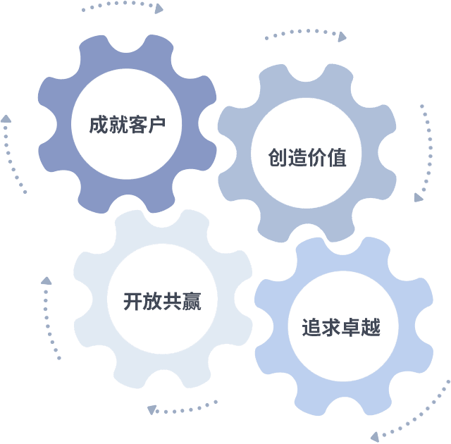 成就客户是一切决策的出发点,,,创造价值是衡量所有工作的标准,,追求卓越是我们做事做人的态度,,,开放共赢是我们的格局也是最终的结果。。价值观的齿轮环环相扣,,,,推动着组织里的每个人不断向前。。。