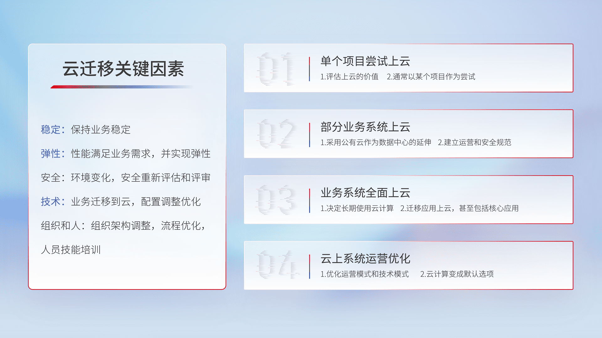 结合实际业务,,,,从规划设计、、云平台选型、、、、云原生改造、、数据迁移、、集成交付,,迁移全过程为客户识别最佳上云路径,,,,做好风险识别管理,,,,设计网络架构、、、、身份权限、、、安全审计合规、、、操作审计、、、、日志审计、、、、监控告警策略、、多站点容灾设计等,,对云上基础设施进行整体规划,,,提升IT治理水平,,,以满足弹性、、高可用、、、、高性能的需求。。。。