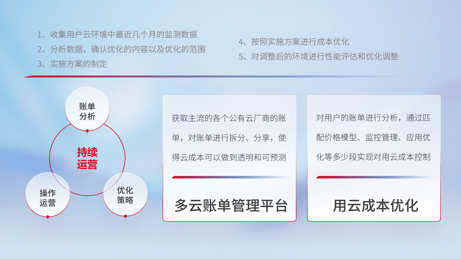 通过多云纳管,,以统一的资源数据模型把客户的云资源进行抽象和封装,,,,进而实现对多云资源的统一操作,,保障云资源管理的可靠性、、、稳定性与可用性。。量身定制化运维内容,,,配置、、开发运维、、、、补丁管理、、、、备份、、、、监控、、、、认证和访问管理、、、、审计和日常巡检等,,保障在用云过程中的可靠度,,,,稳定度以及高可用率。。。。
